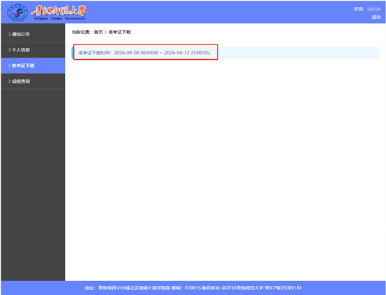 2.准考证打印请登录https://zscx.qhnu.edu.cn/bmpt/bmxx, 账号为本人身份证号,密码为身份证后六位。点击左侧菜单【准考证下载】进行准考证下载及打印,系统开放时间为4月8日8:00-4月12日23:00。